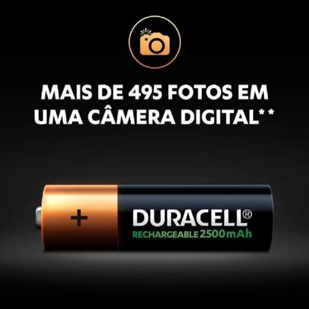 Ideais para controles de vídeo game, brinquedos, câmeras digitais e muitos outros aparelhos, as pilhas recarregáveis Duracell AA 2500 mAh podem ser recarregadas centenas de vezes em qualquer carregador NiMH. Além de serem pré-carregadas na fabricação, o que possibilita o uso imediato, elas permanecem carregadas por até 12 meses quando não estão em uso e têm duração de até 10 anos.- Marca: DURACELL- Modelo: DX1500